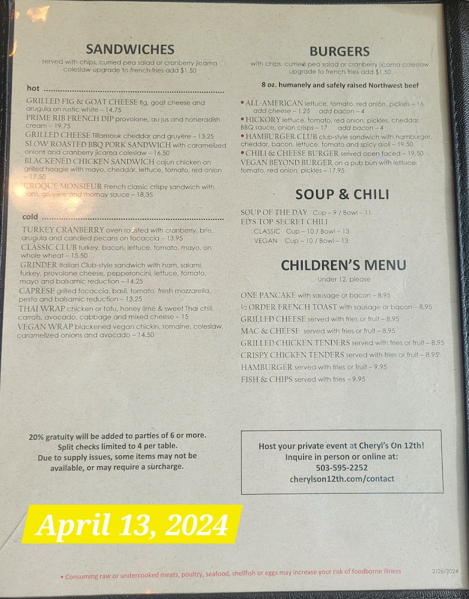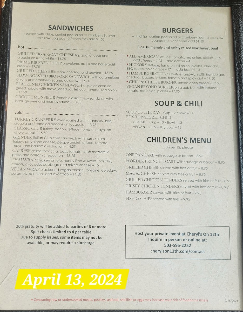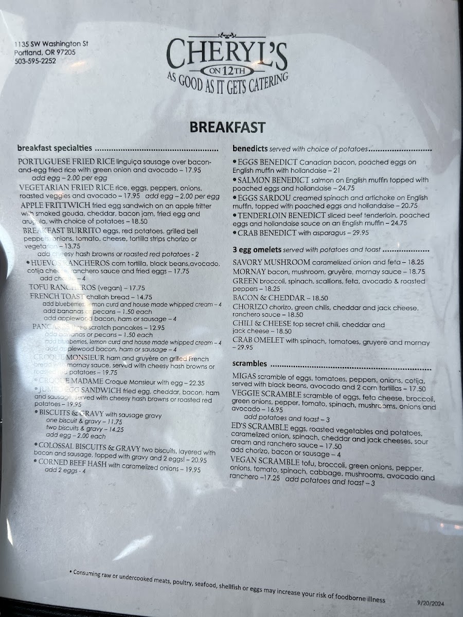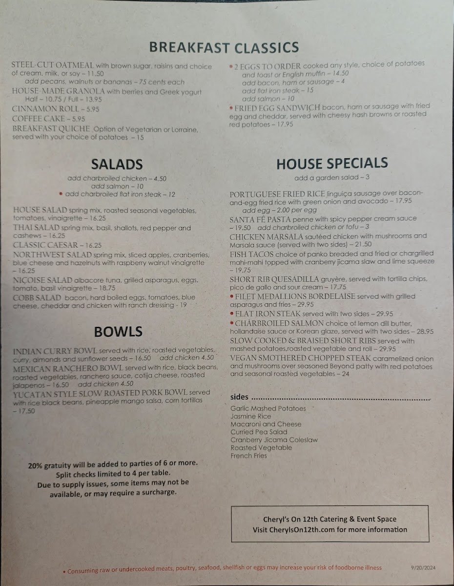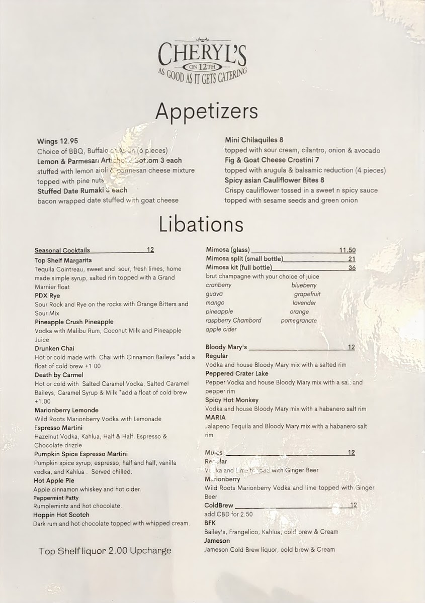 Cheryl's on 12th Menu