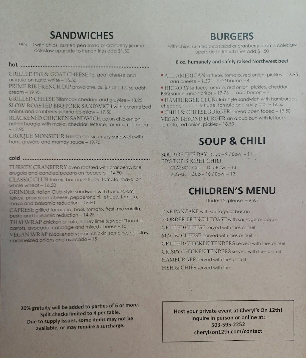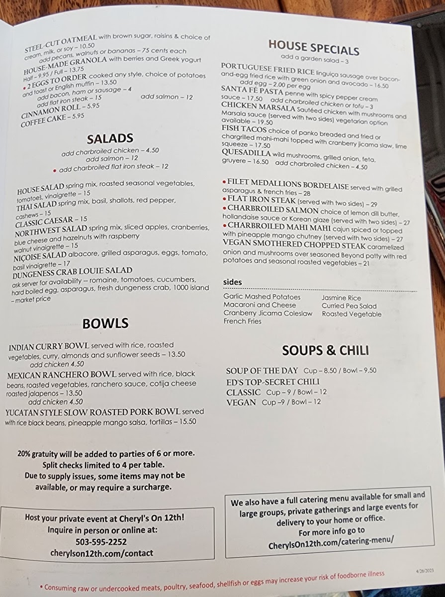 Introducing the menu at Cheryl's on 12th, a vibrant New American restaurant nestled in the heart of Portland, Oregon. This culinary gem showcases a delightful array of dishes that will excite any palate. Start with their Blackened Chicken Sandwich or the indulgent Grilled Fig & Goat Cheese for a delectable twist. Salads like the Northwest Salad stand out with fresh local ingredients, while breakfast options like Huevos Rancheros and Tofu Rancheros cater to both savory and vegan enthusiasts. Guests rave about their attentive service, warm ambiance, and complimentary beignets—a sweet touch to any meal. The restaurant also features outdoor seating, perfect for enjoying Portland’s pleasant weather. With a commitment to quality and memorable experiences, Cheryl's on 12th is undoubtedly a must-visit for anyone seeking a delightful dining adventure.